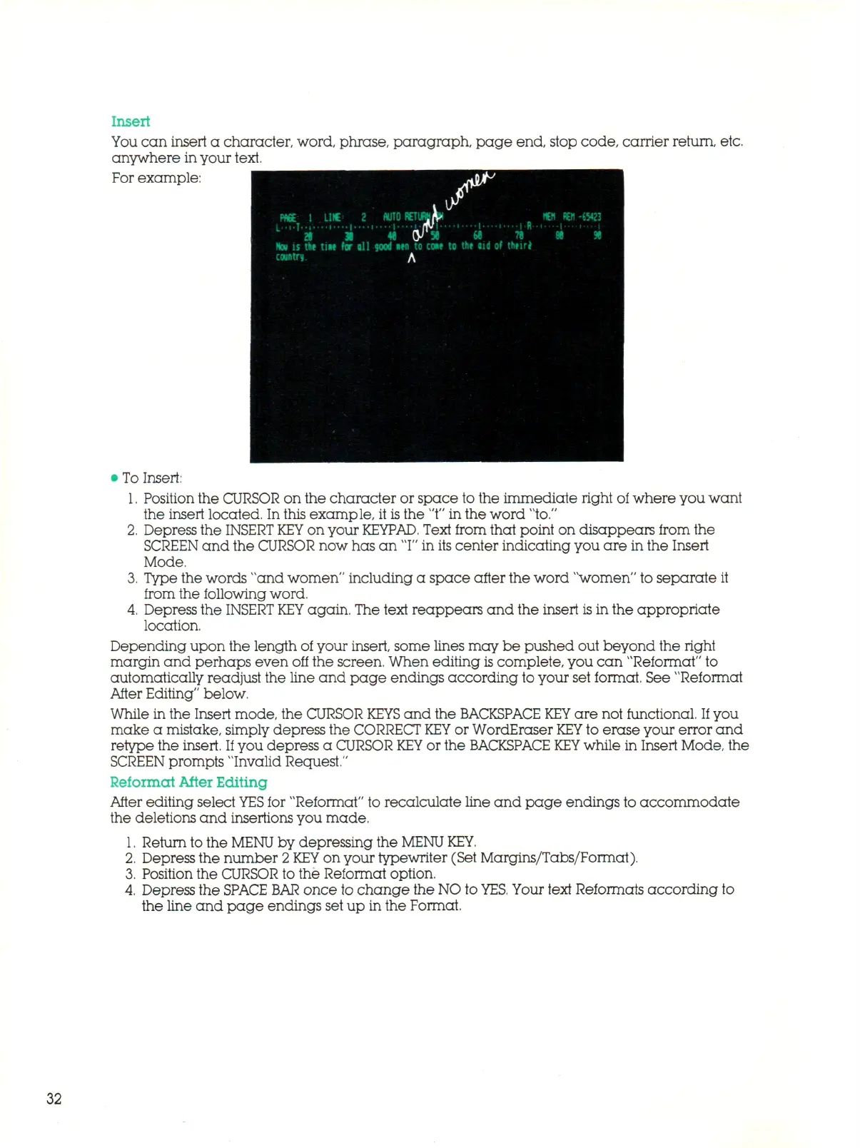 automatically readjust the line and page endings according to your set format. See "Reformat