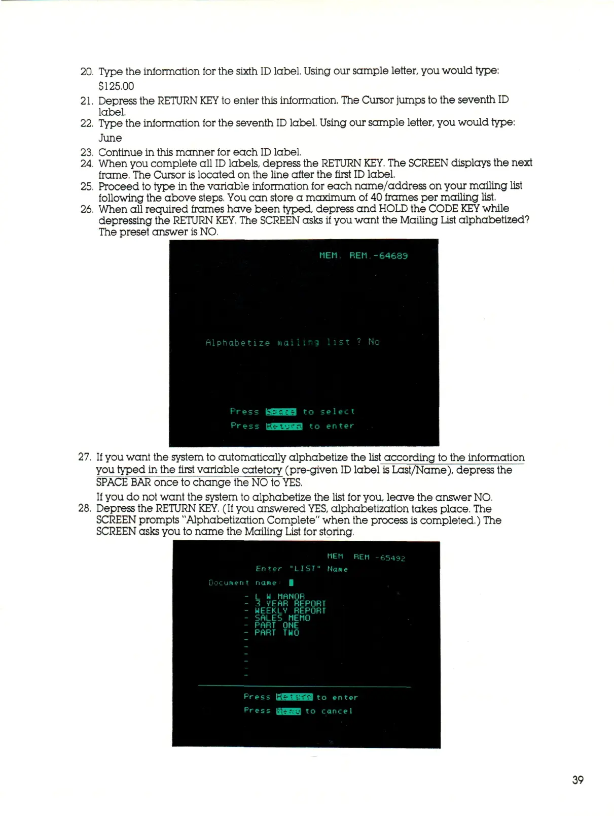 SCREEN prompts "Alphabetization Complete" when the process is completed.) The