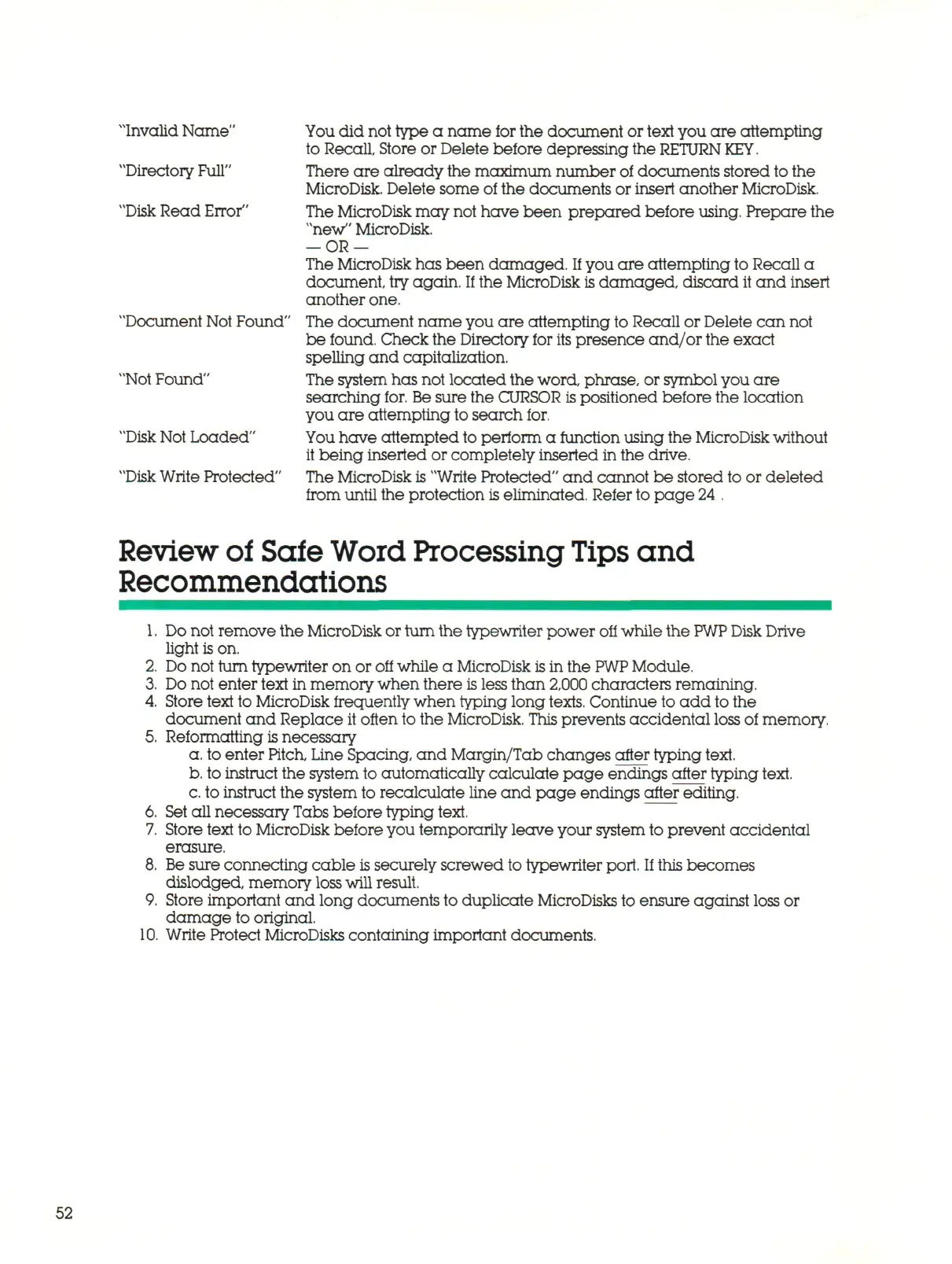 Do not remove the MicroDisk or turn the typewriter power off while the