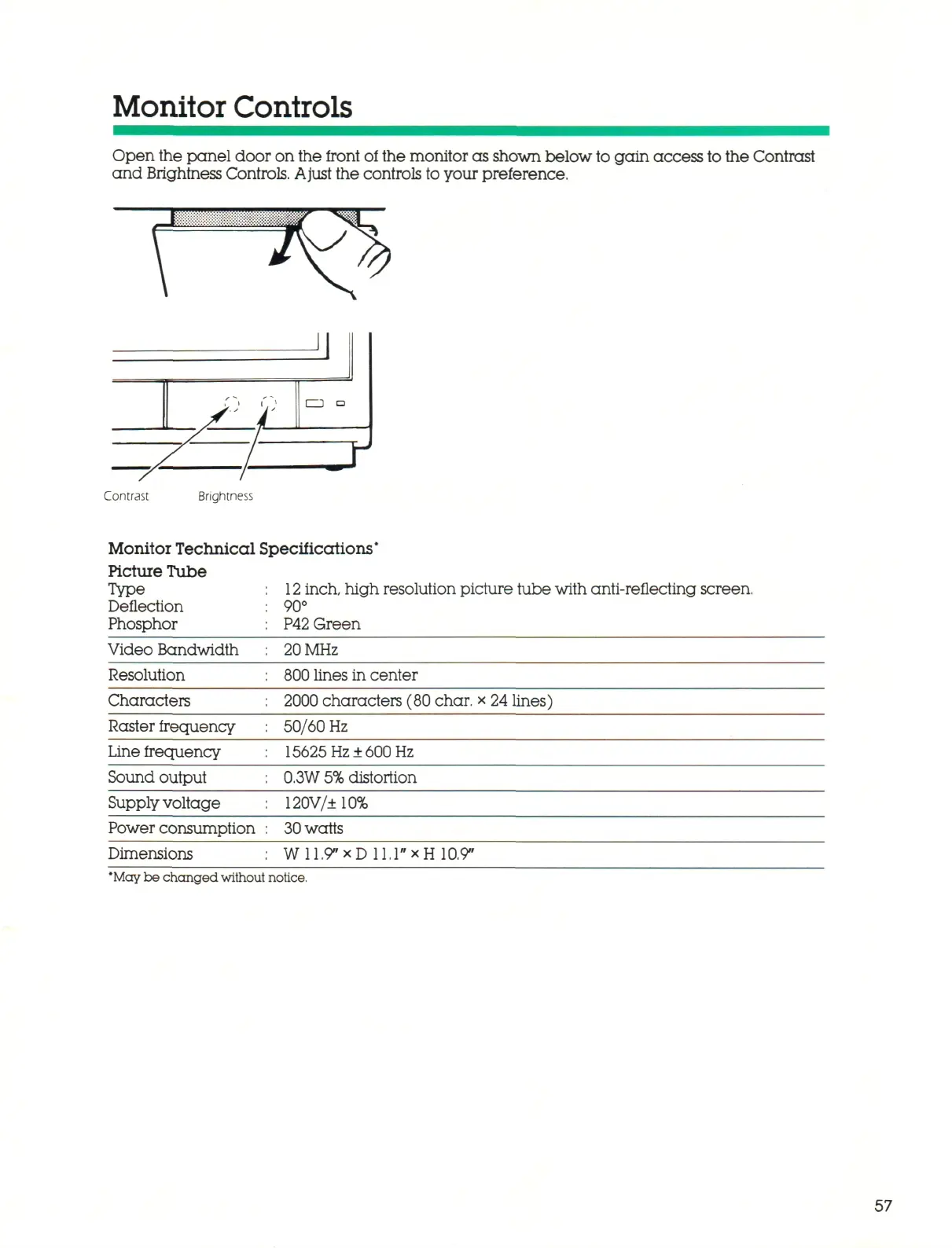 Open the panel door on the front of the monitor as shown below to gain access to the Contrast