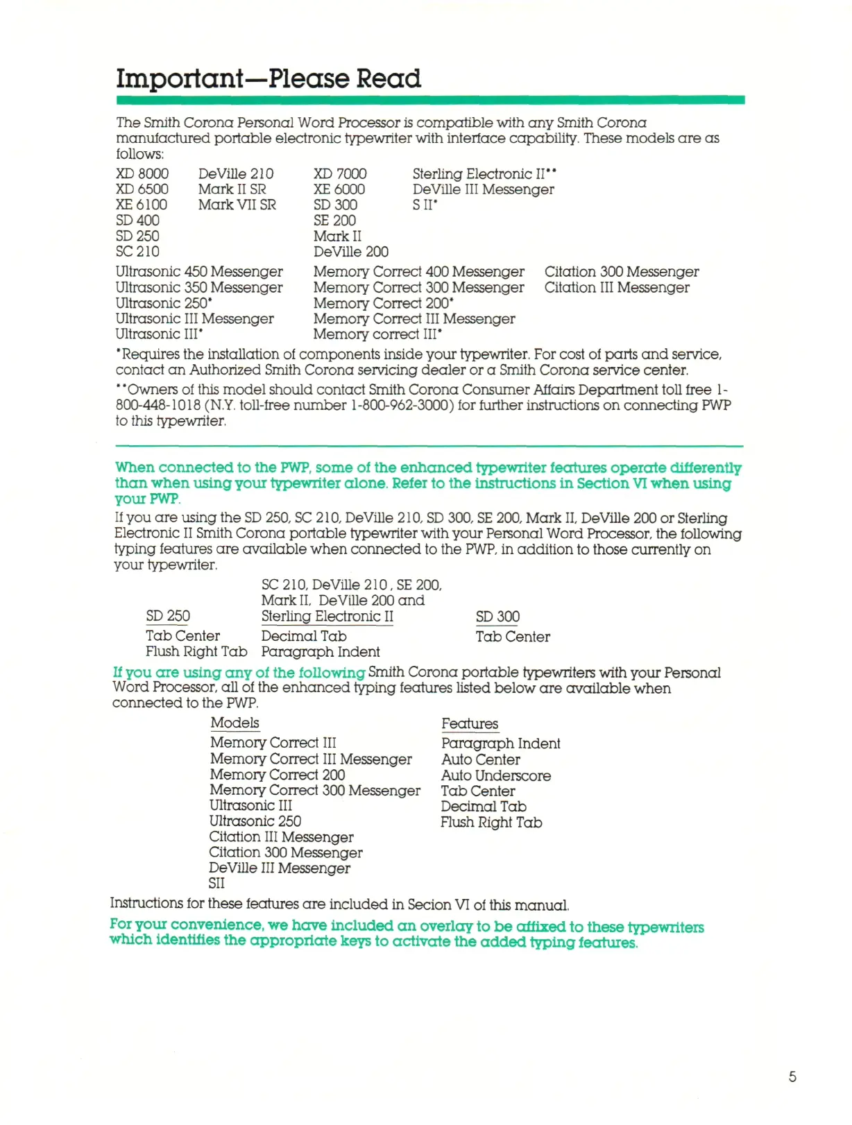 * "Owners of this model should contact Smith Corona Consumer Affairs Department toll free 1-