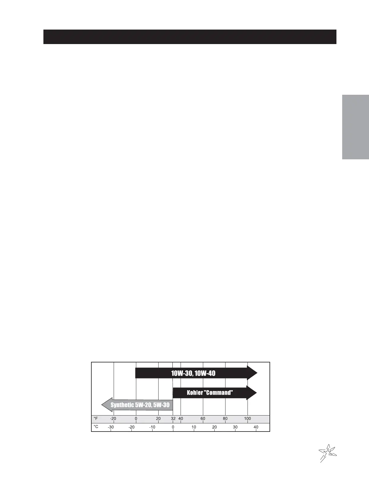 Change and add oil according to charts below. Do not overfill. Use a high quality detergent oil. For Kohler