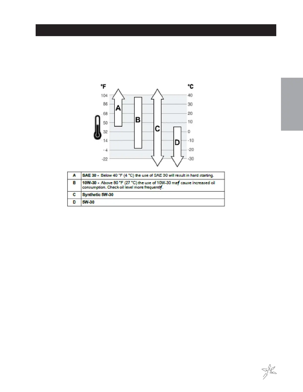 Change and add oil according to charts below. Do not overfill. Use a high quality detergent oil. For Briggs engine