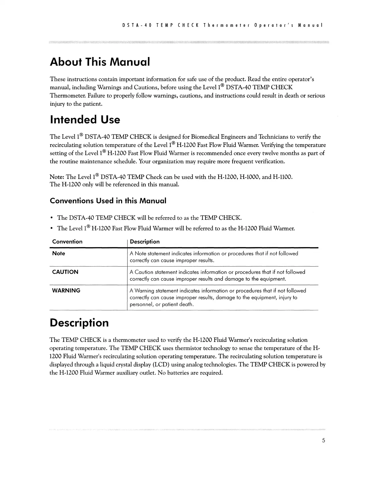 Smiths Level 1 DSTA-40 - About this Manual; Intended Use; Conventions Used in this Manual