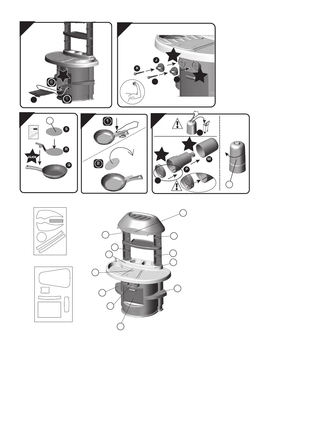Smoby Nova Kitchen - Step 7: Attaching Shelves; Step 8: Attaching Accessories J and K; Step 9: Attaching Pan S; Step 10: Attaching Pots M and N