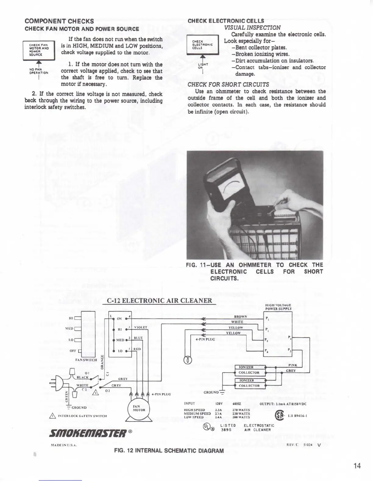 Smokemaster C-12 - Component Checks; Fan Motor and Power Source Checks; Visual Cell Inspection; Cell Short Circuit Testing