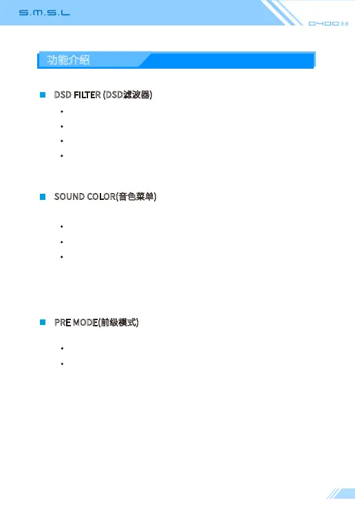 SMSL D400 ES - Advanced Audio Function Settings; DSD Filter Selections; Sound Color Customization; Pre-Amplifier Mode Configuration