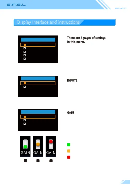 SMSL SP400 - Display Settings and Options; Settings menu structure and input selection; Gain and volume mode settings