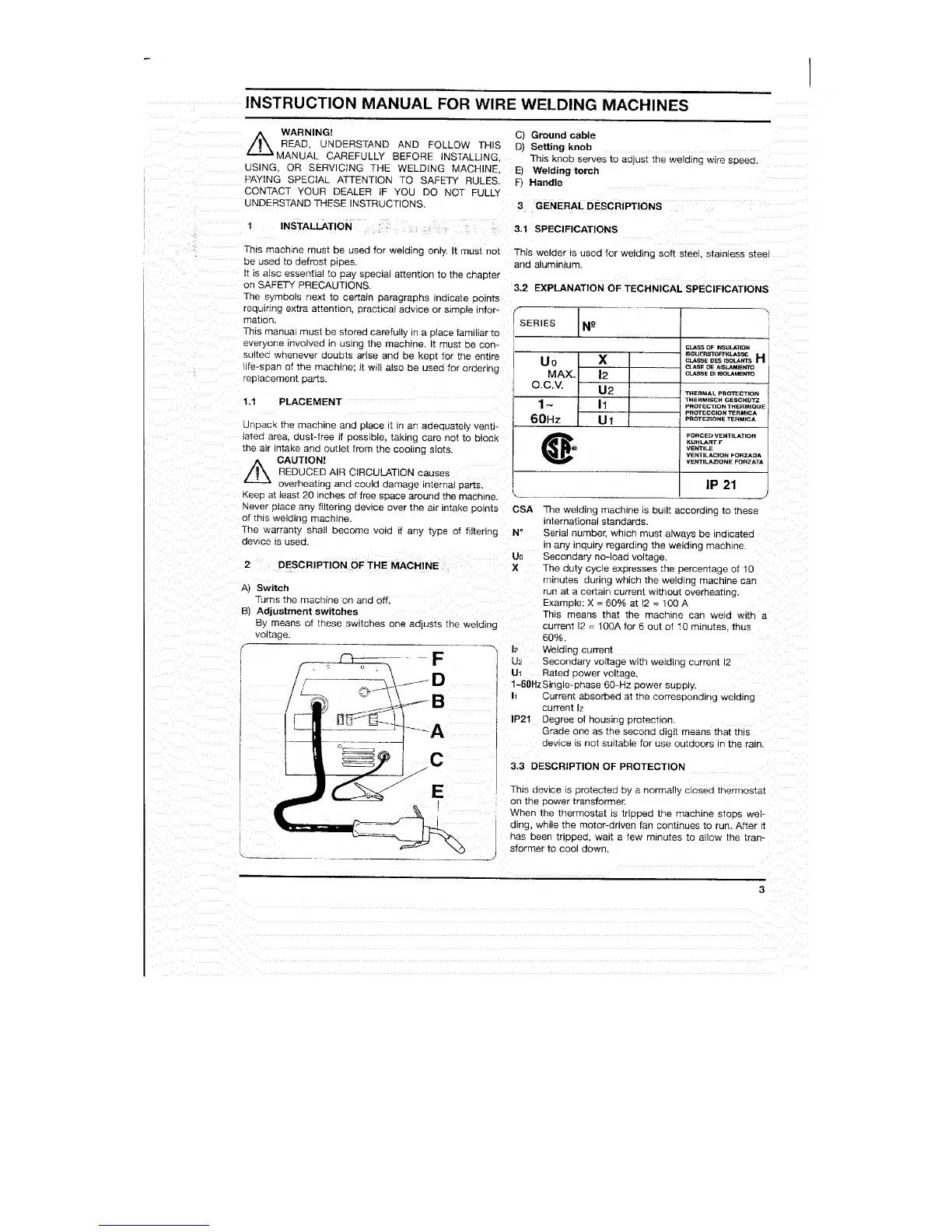 Snap-On MIG 110 - Installation; Placement; General Descriptions; Specifications