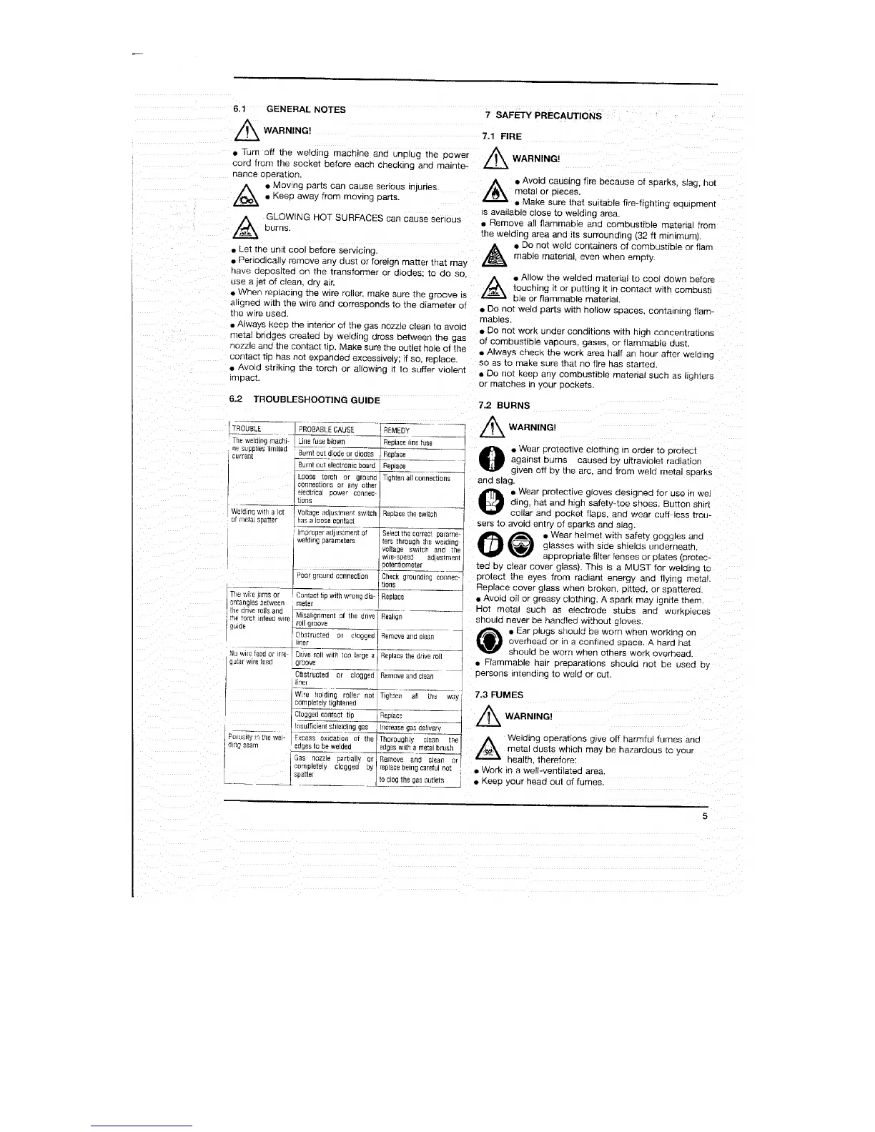 Snap-On MIG 110 - General Notes; Safety Precautions; Troubleshooting Guide; Burns