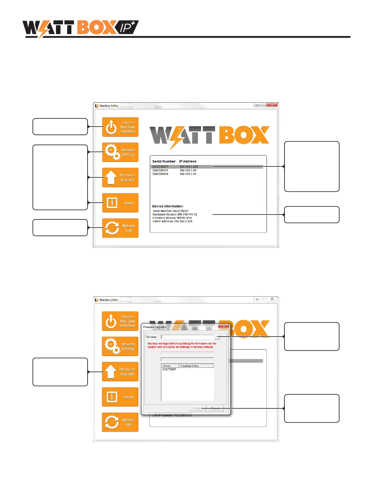When you run the utility, all WattBox IP-enabled devices on the network will appear in the device list.