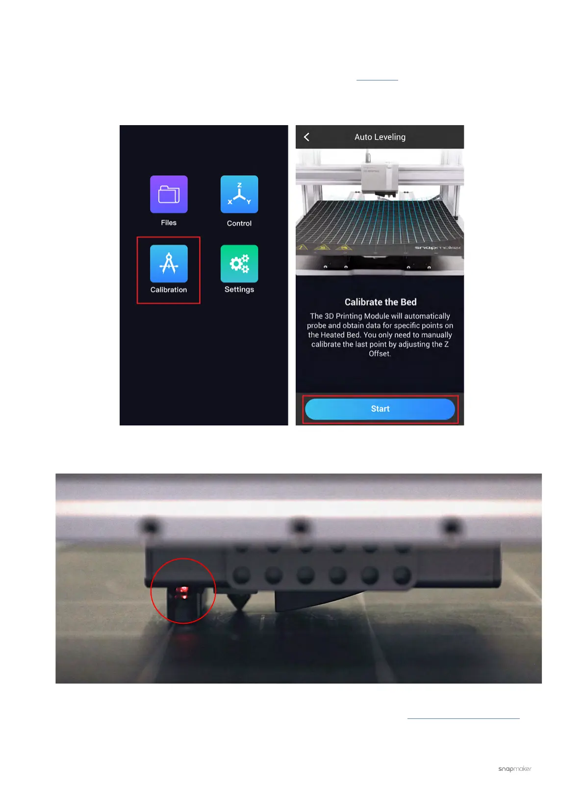 left to tap Calibration and tap Start to run Auto Leveling; the 3D Printing Module is expected to go back to