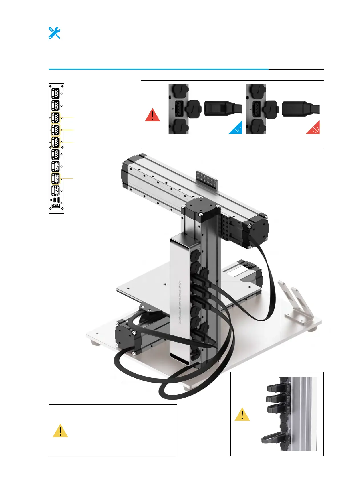 Open the dust plugs, and then connect the X, Y, Z axes and the Heated