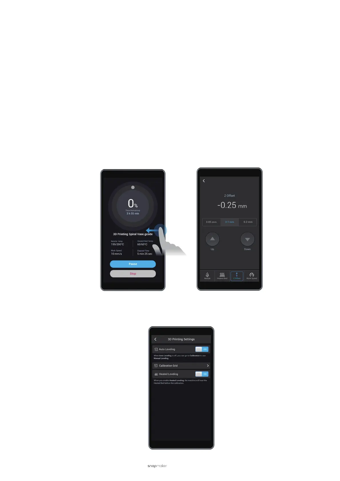 out, swipe left on the Touchscreen and tap Z Offset at the bottom. Tap Up or Down to adjust the nozzle height.