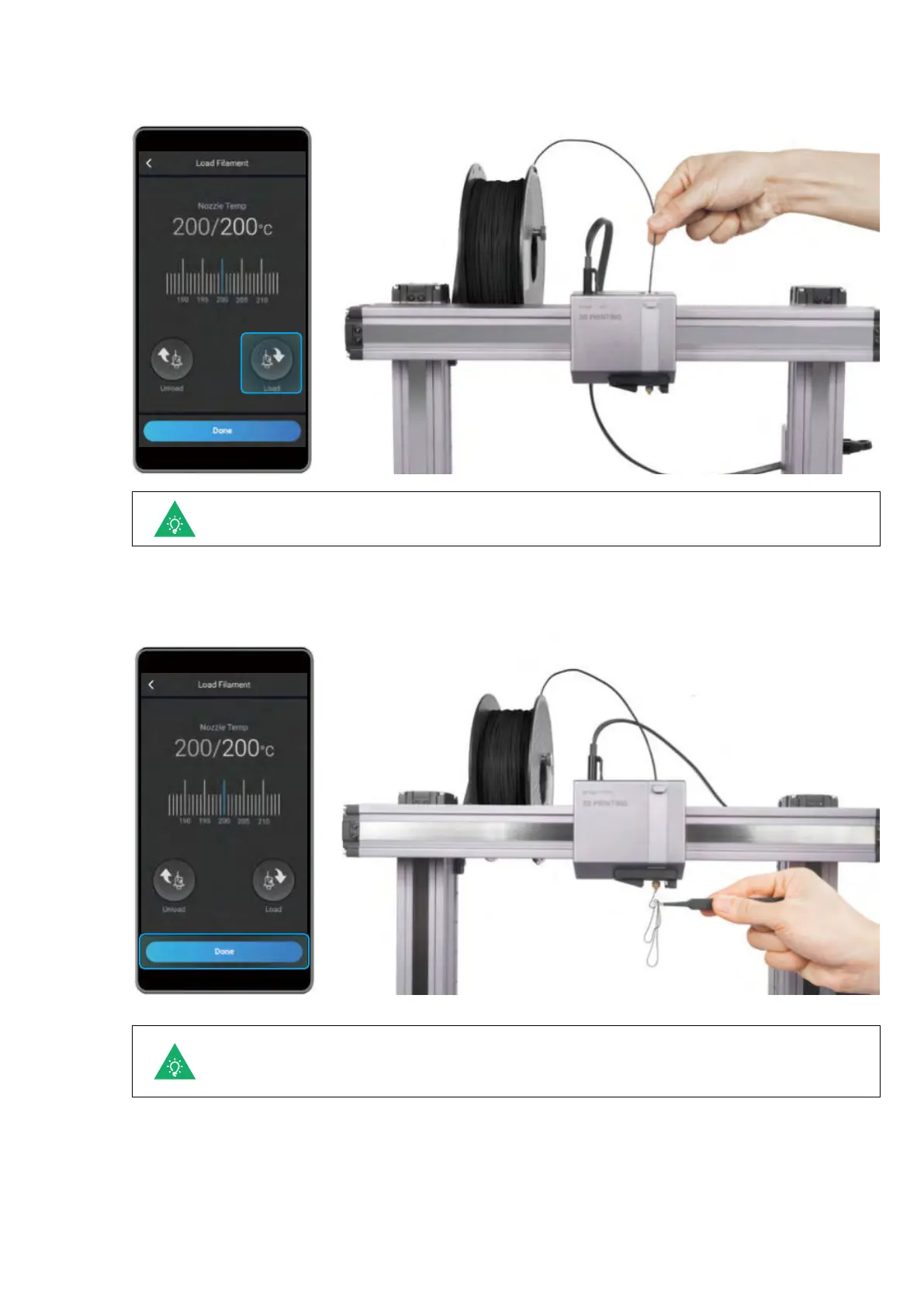 If no filament is coming out of the nozzle, do not tap Done until you repeat the steps above