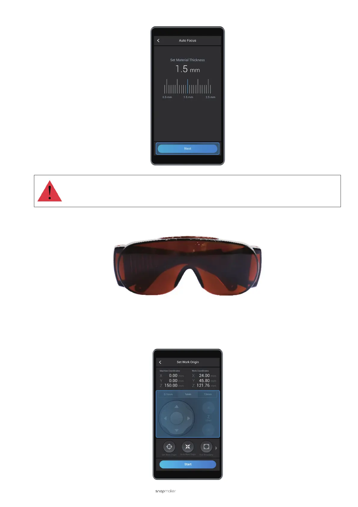 (7) Tap X-, X+, Y-, or Y+ to move the laser dot to where the work origin will be, and then tap Set Work Origin. Next,