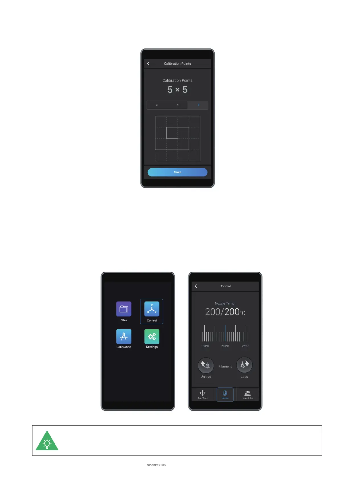 (1) Heat the nozzle. On the APP List Screen, tap Control > Nozzle. Slide the scale bar left or right to set the target