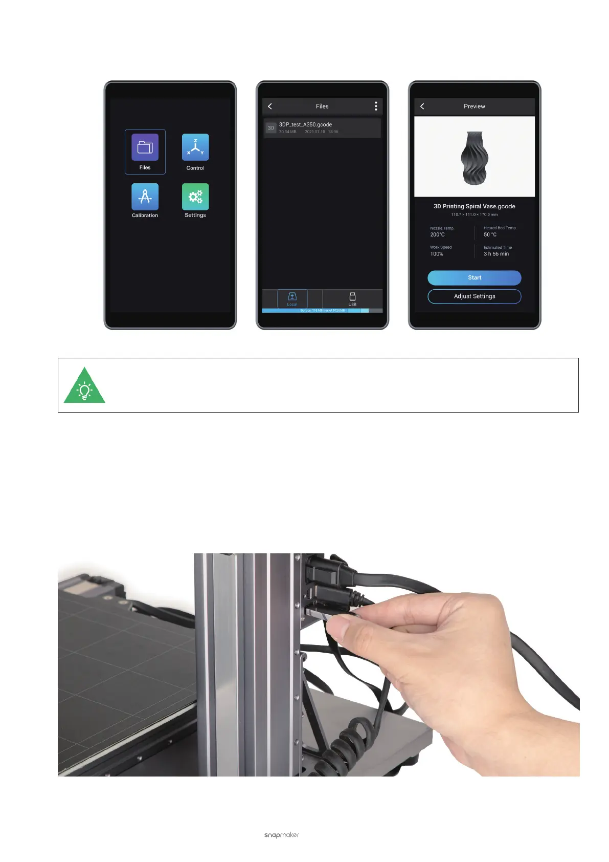 (3) On the Touchscreen, nd the G-code le by tapping Files > USB. Preview the le, check the printing settings,