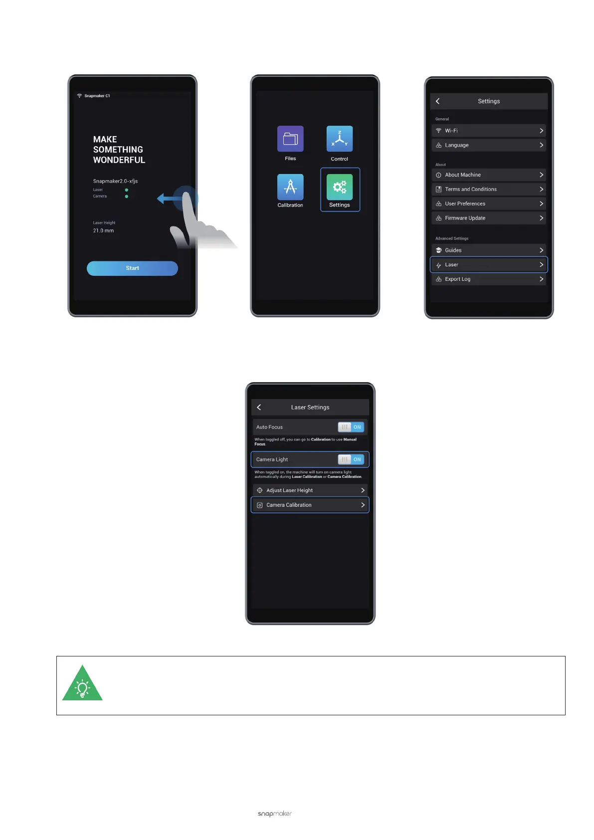 (2) On the Touchscreen, swipe left and tap Settings > Laser to enter Laser Settings.