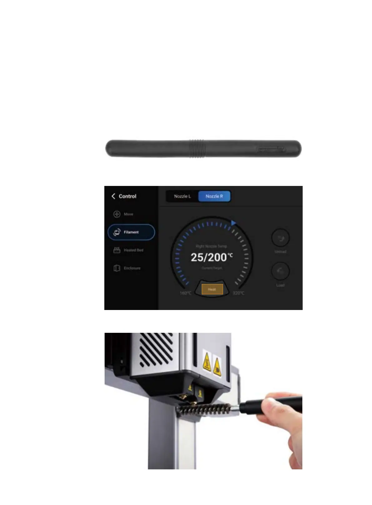 2. Power on the machine, tap Control > Filament on the Touchscreen, and heat the target nozzle to 200