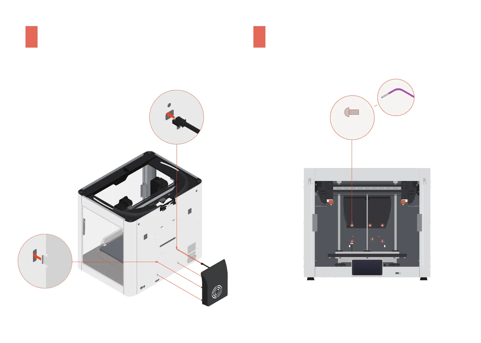 接続ケーブルを穴に通し、プリント冷却ファンを所定の位置にロックします。