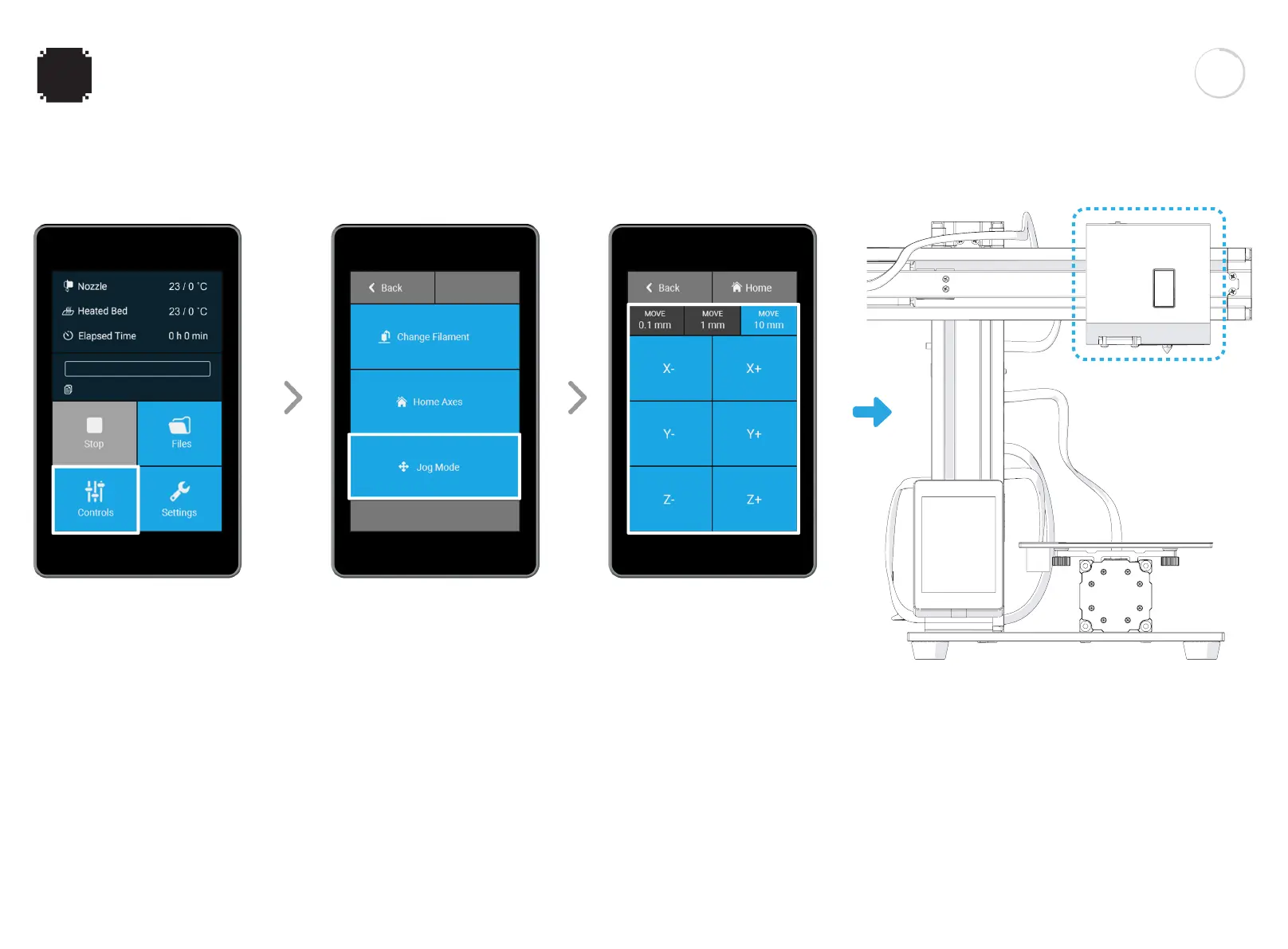 Verwenden Sie den Jog-Modus, um das 3D-Druckmodul an die dargestellte Position zu bewegen󱡋󵫞󽘘󵋠󱶴󴝘󳑎󽘙󲺽󳨈󱼋󴝘󶳧󶌕󱶴󱳭󲓤󶆺󱟺󶷉