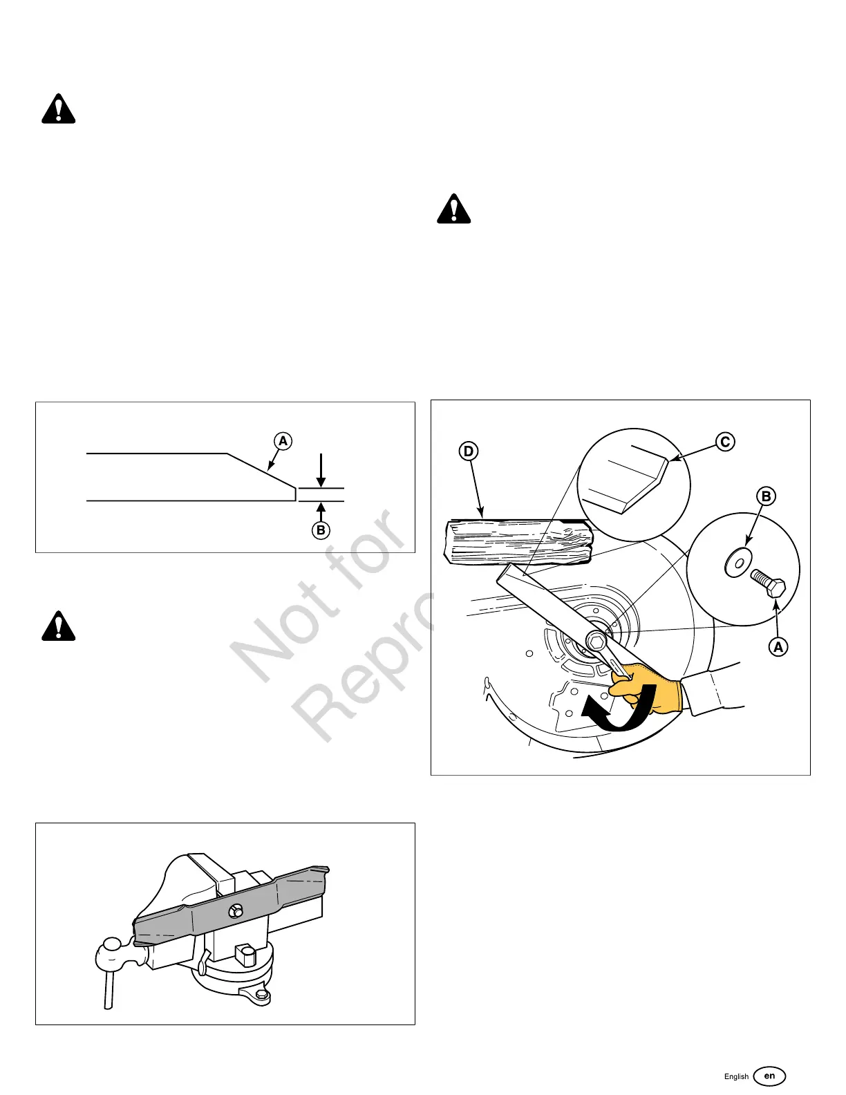 2. Wedge a wooden block (D) between the mower blade