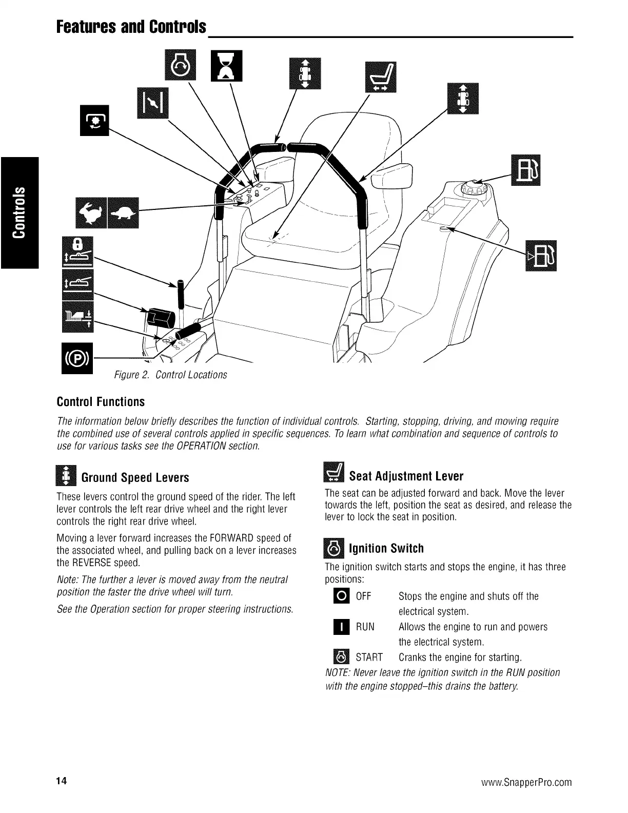 Theinformation below briefly describes the function of individual controls. Starting, stopping, driving, and mowing require