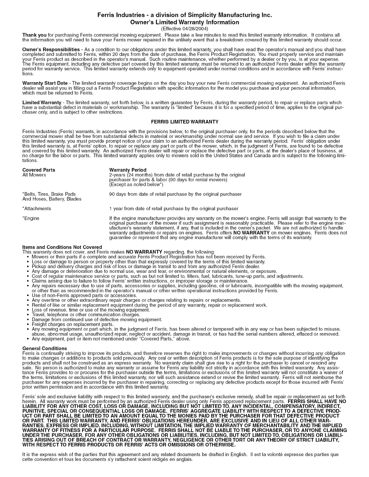 completed and submitted to Ferris, within 20 days from the date of purchase, the Ferris Product Registration. You must properly service and maintain
