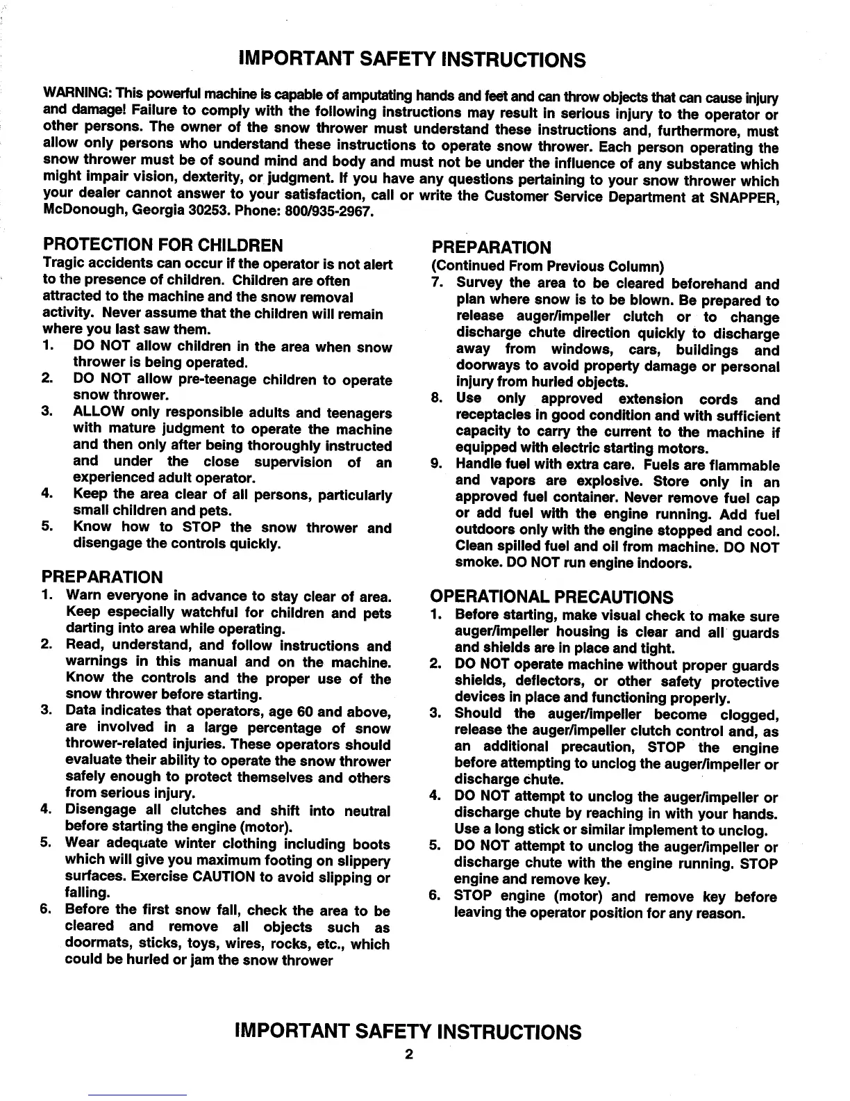 your dealer cannot answer to your satisfaction, call or write the Customer Service Department at SNAPPER,