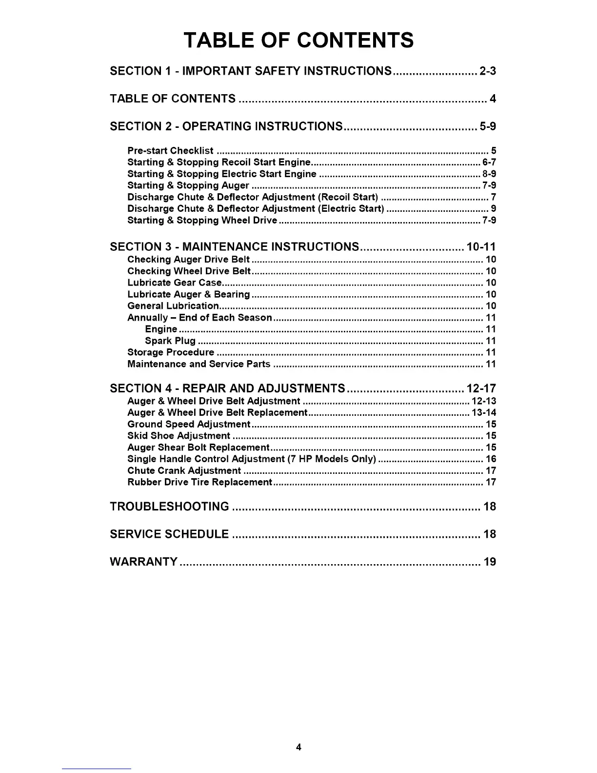 Auger & Wheel Drive Belt Adjustment .............................................................. 12-13