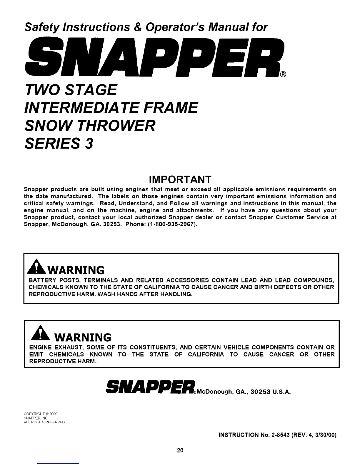 Snapper, McDonough, GA. 30253. Phone: (1-800-935-2967).