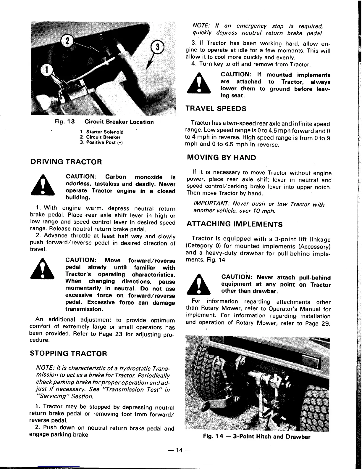 Snapper 1855 Series - Driving and Stopping Procedures; Travel and Movement; Attaching Implements; Lubrication