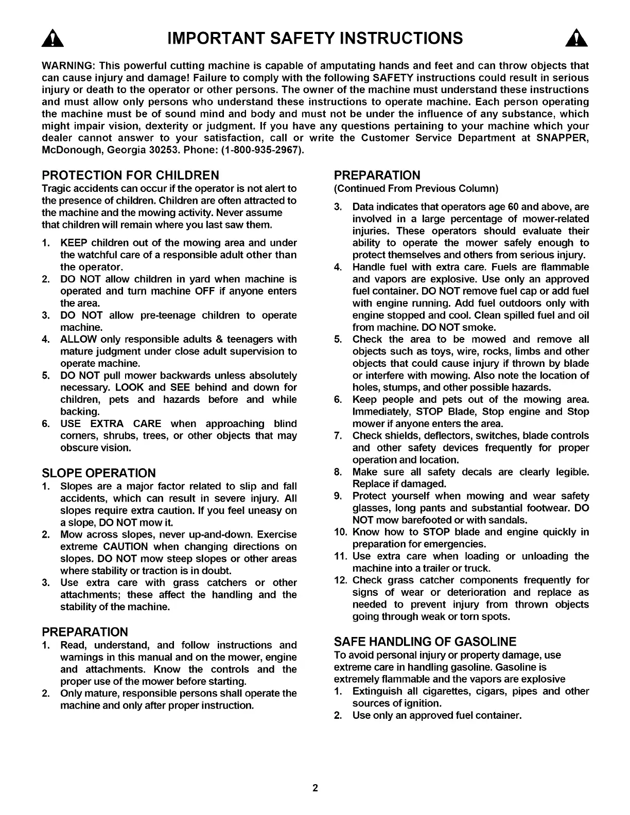 dealer cannot answer to your satisfaction, call or write the Customer Service Department at SNAPPER,