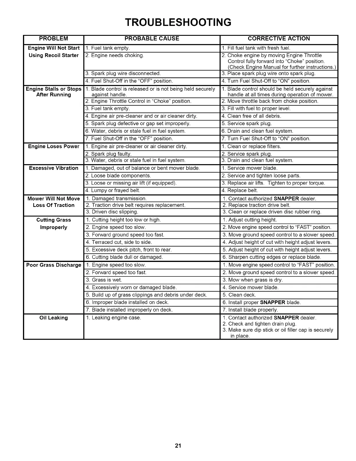1. Contact authorized SNAPPER dealer.