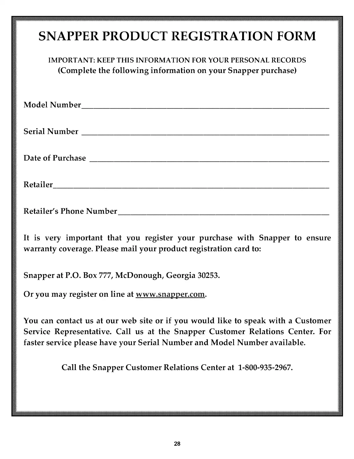 (Complete the following information on your Snapper purchase)