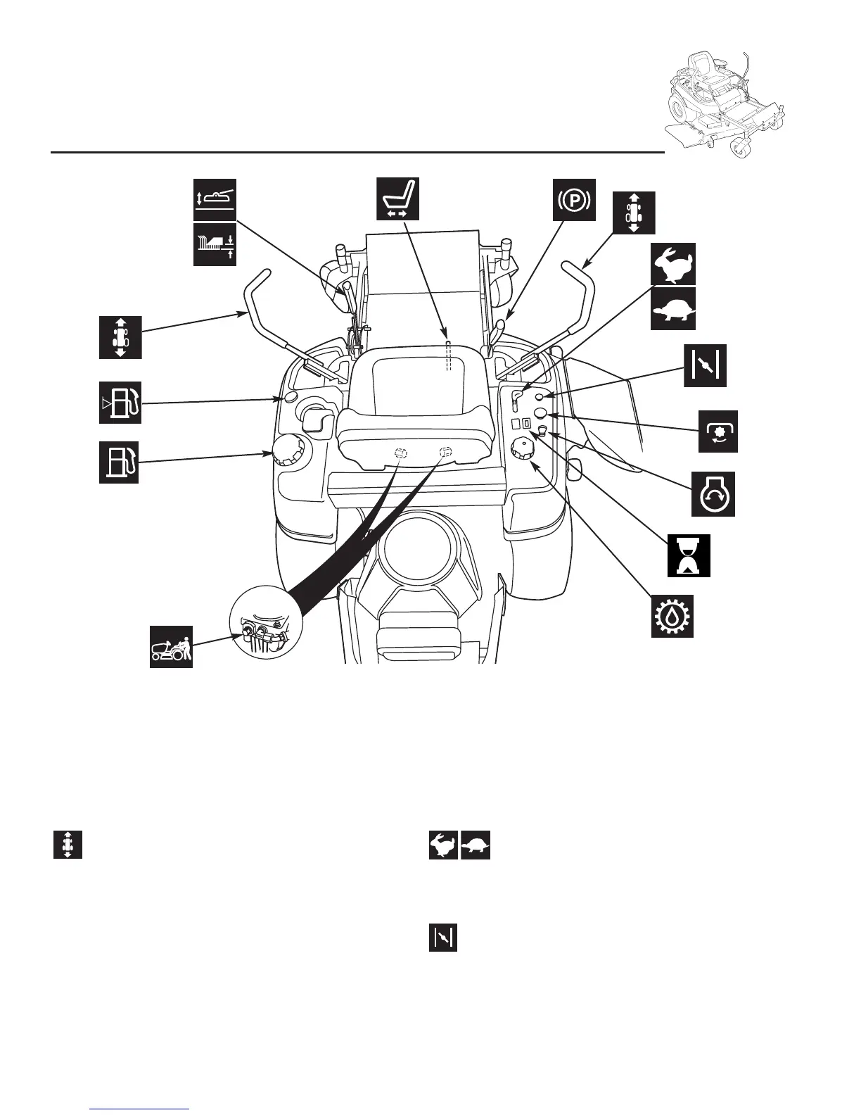The information below briefly describes the function of individual controls. Starting, stopping, driving, and mowing