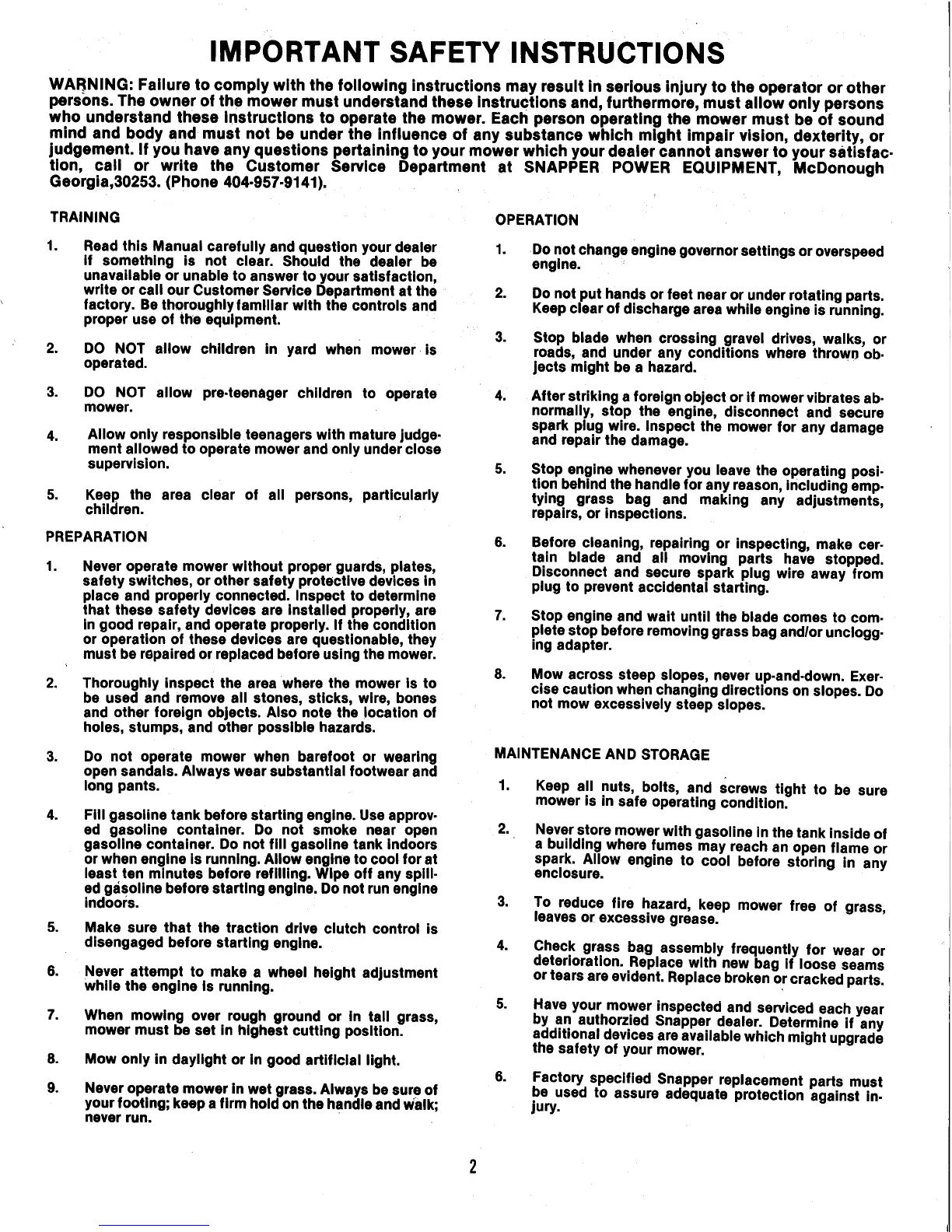 Snapper 214X4PR - Important Safety Instructions; Training; Preparation