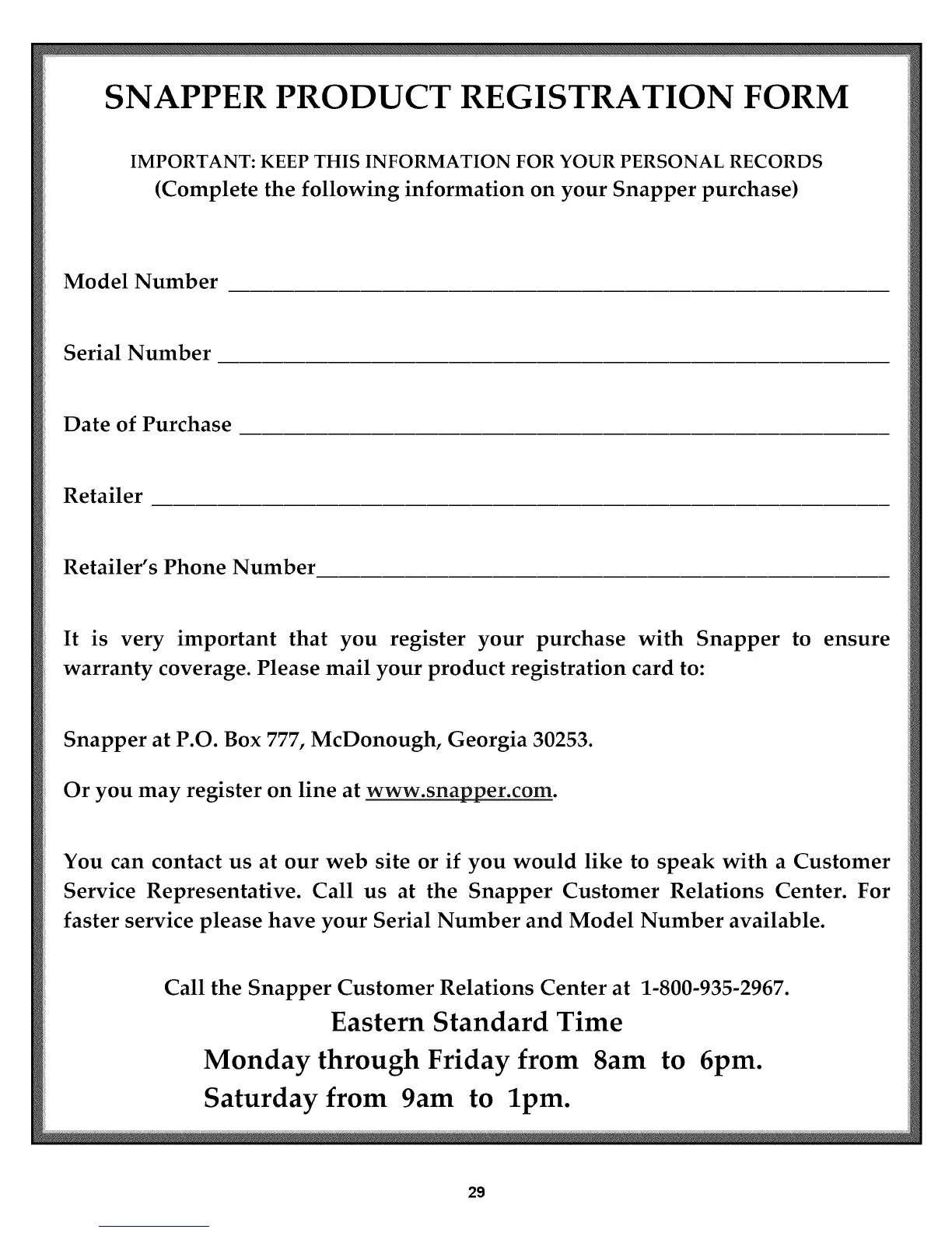 Service Representative. Call us at the Snapper Customer Relations Center. For