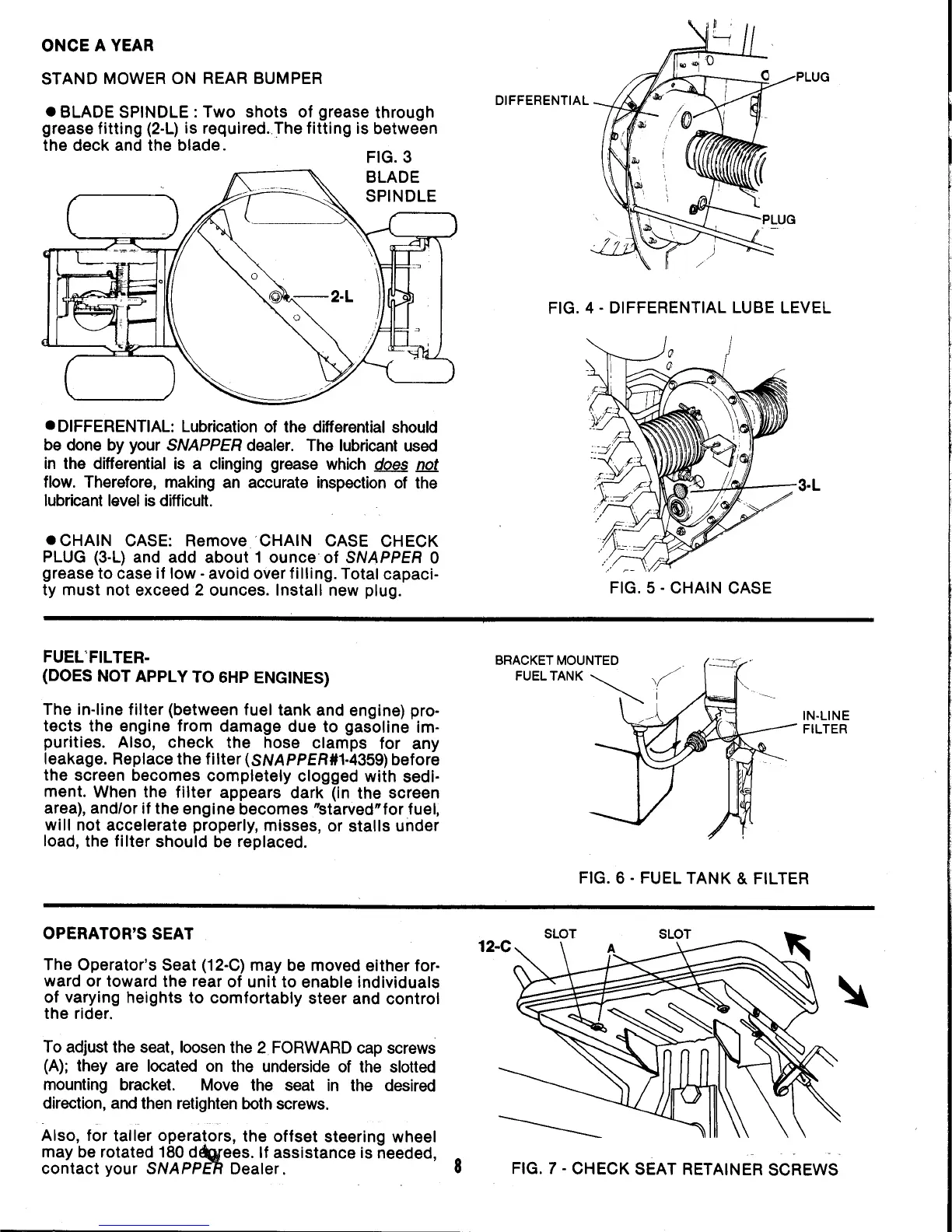 Snapper 250612T - Annual Maintenance and Adjustments; Once a Year Service; Fuel Filter and Operator Seat