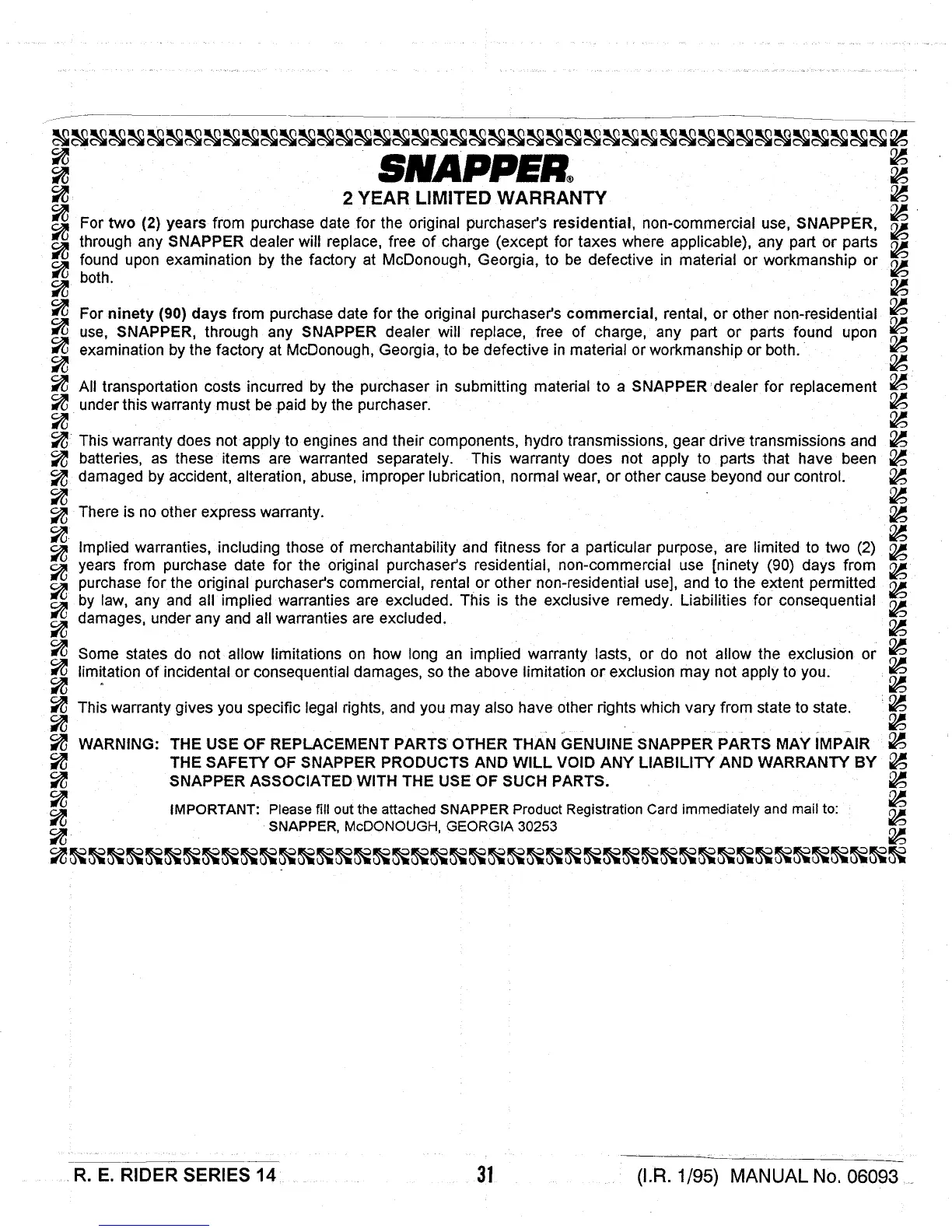 Snapper 250814BE - Snapper 2 Year Limited Warranty