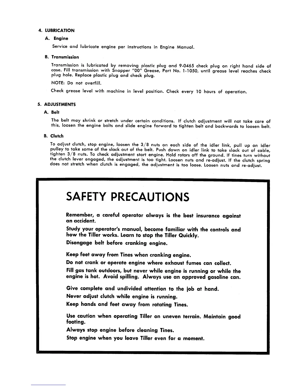 Snapper 300-500 - Lubrication; Adjustments; Safety Precautions