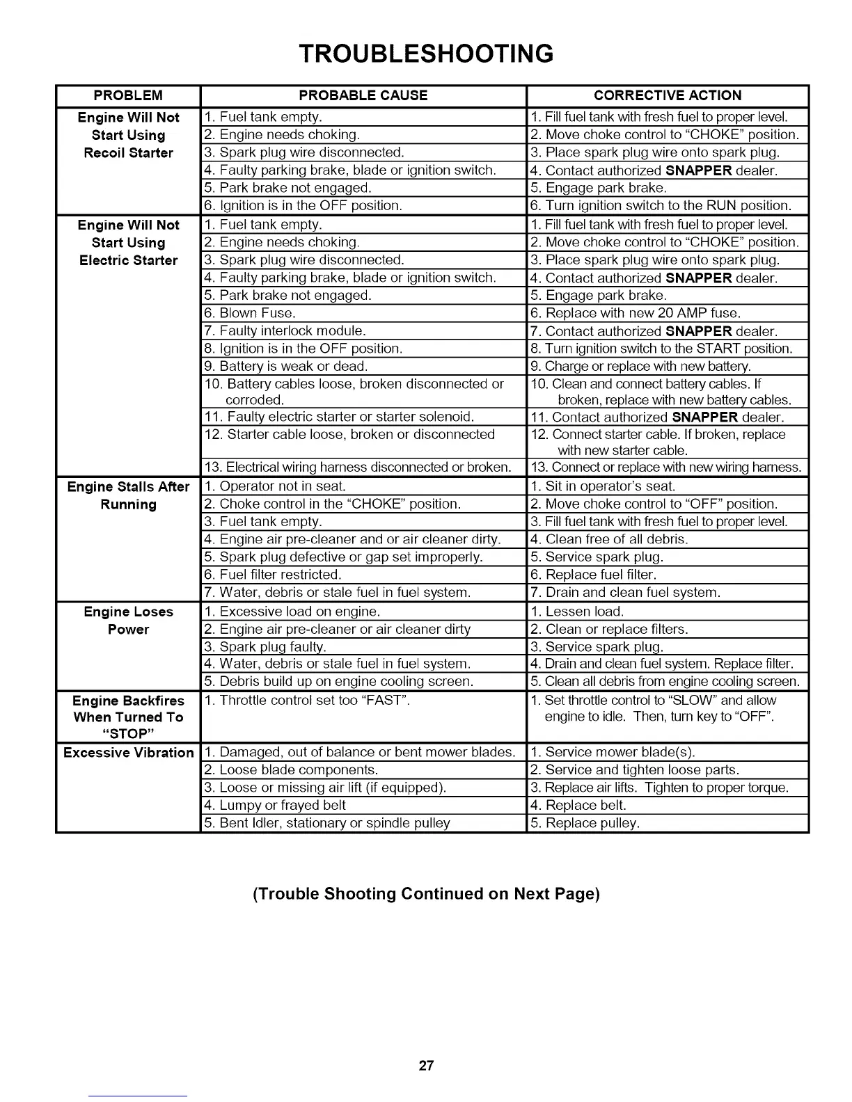 11. Contact authorized SNAPPER dealer.