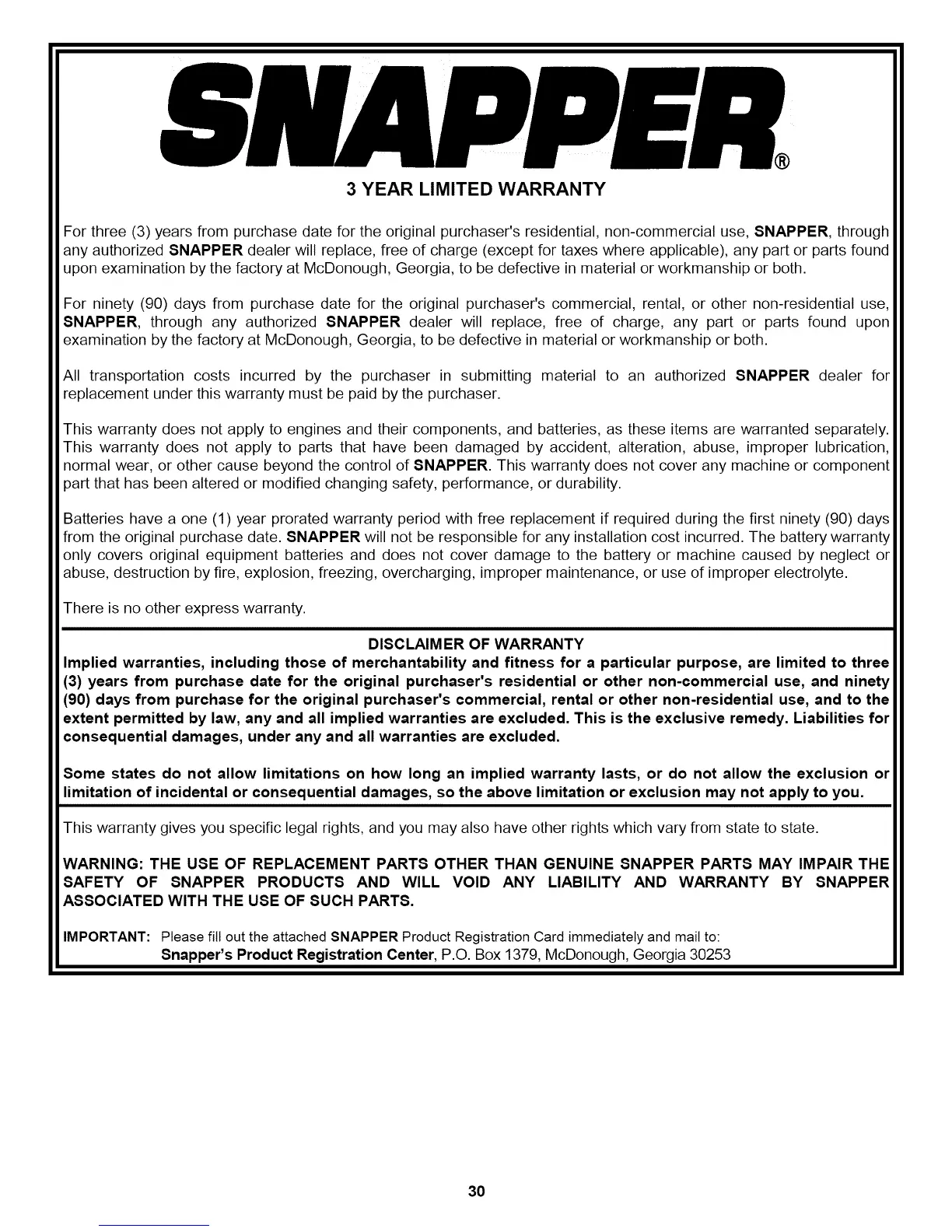 Snapper's Product Registration Center, P.O. Box 1379, McDonough, Georgia 30253