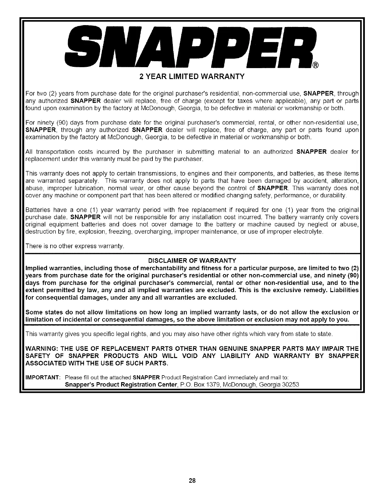Snapper's Product Registration Center, P.O. Box 1379, McDonough, Georgia 30253