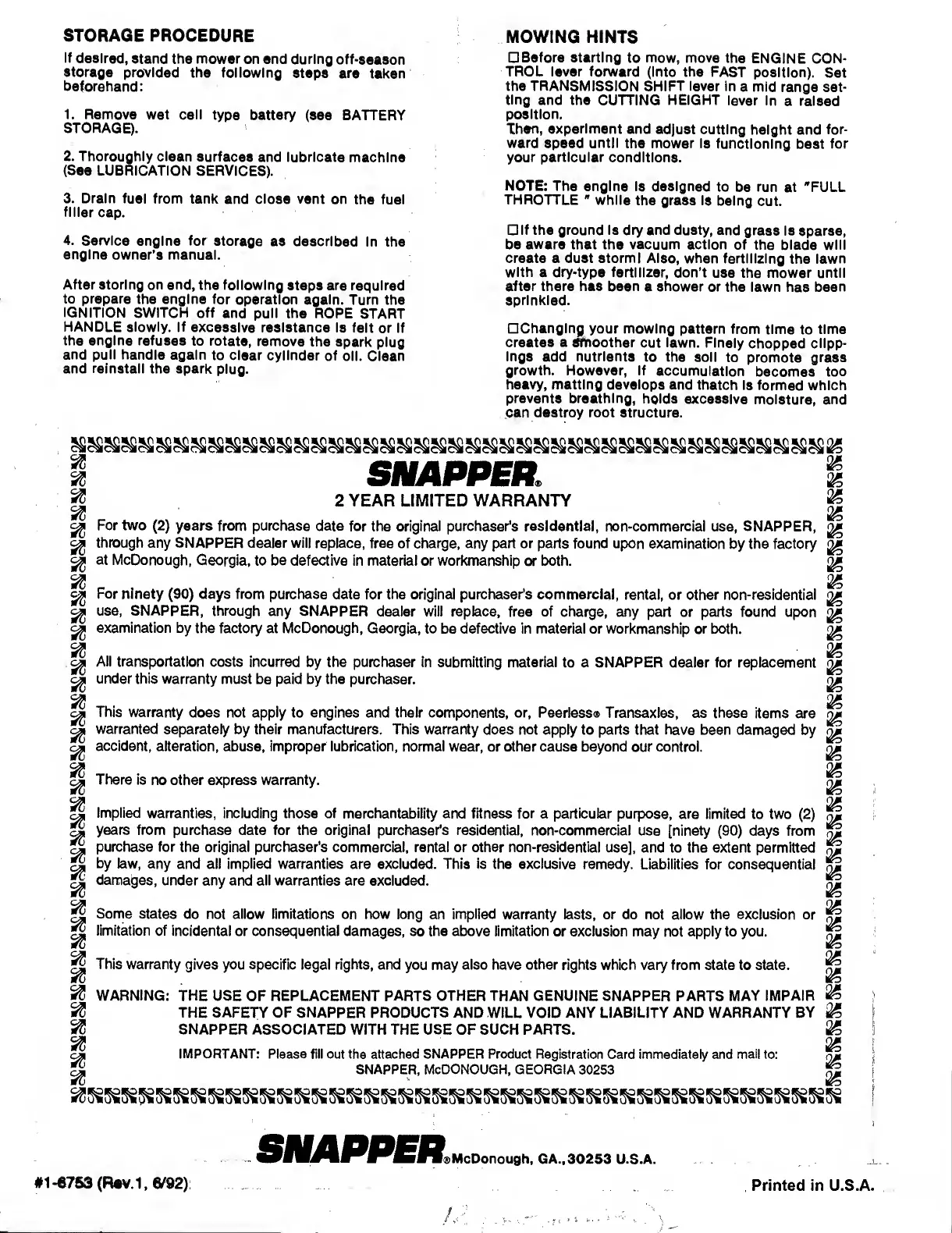 Snapper 8 Series - Storage Procedure; Mowing Hints; Year Limited Warranty