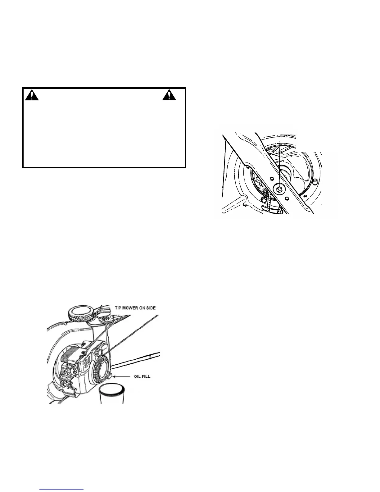 blade cap screw. Do not tilt mower with spark plug or