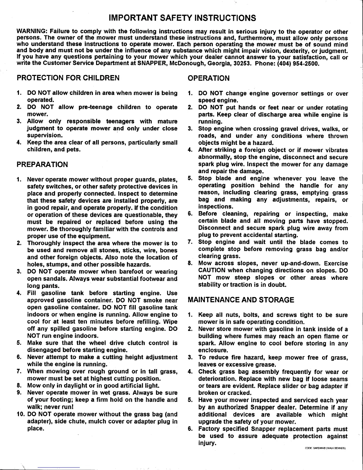 Snapper FRP21600TV - Safety Instructions; Protection for Children; Preparation for Safe Operation; General Operation Safety Rules