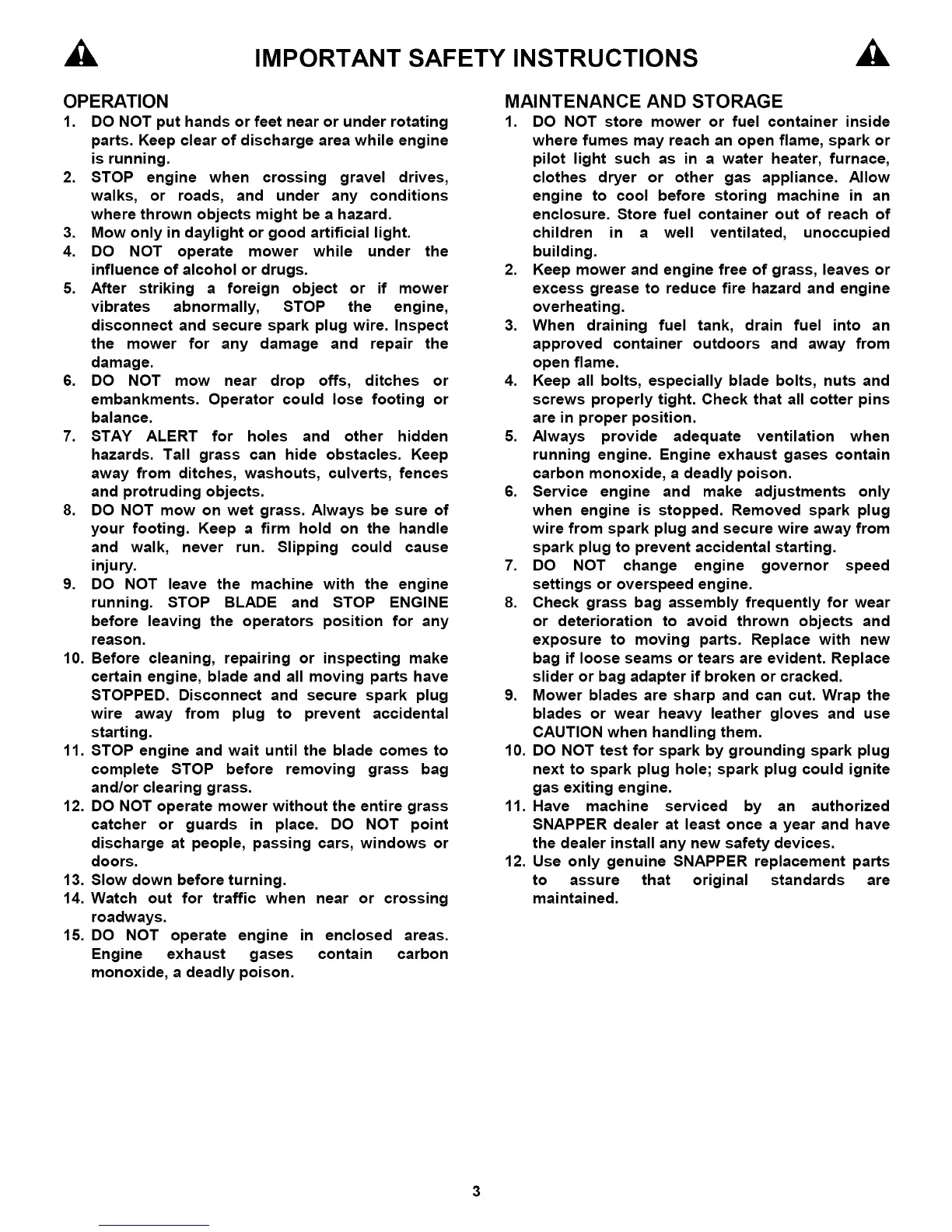 12. Use only genuine SNAPPER replacement parts