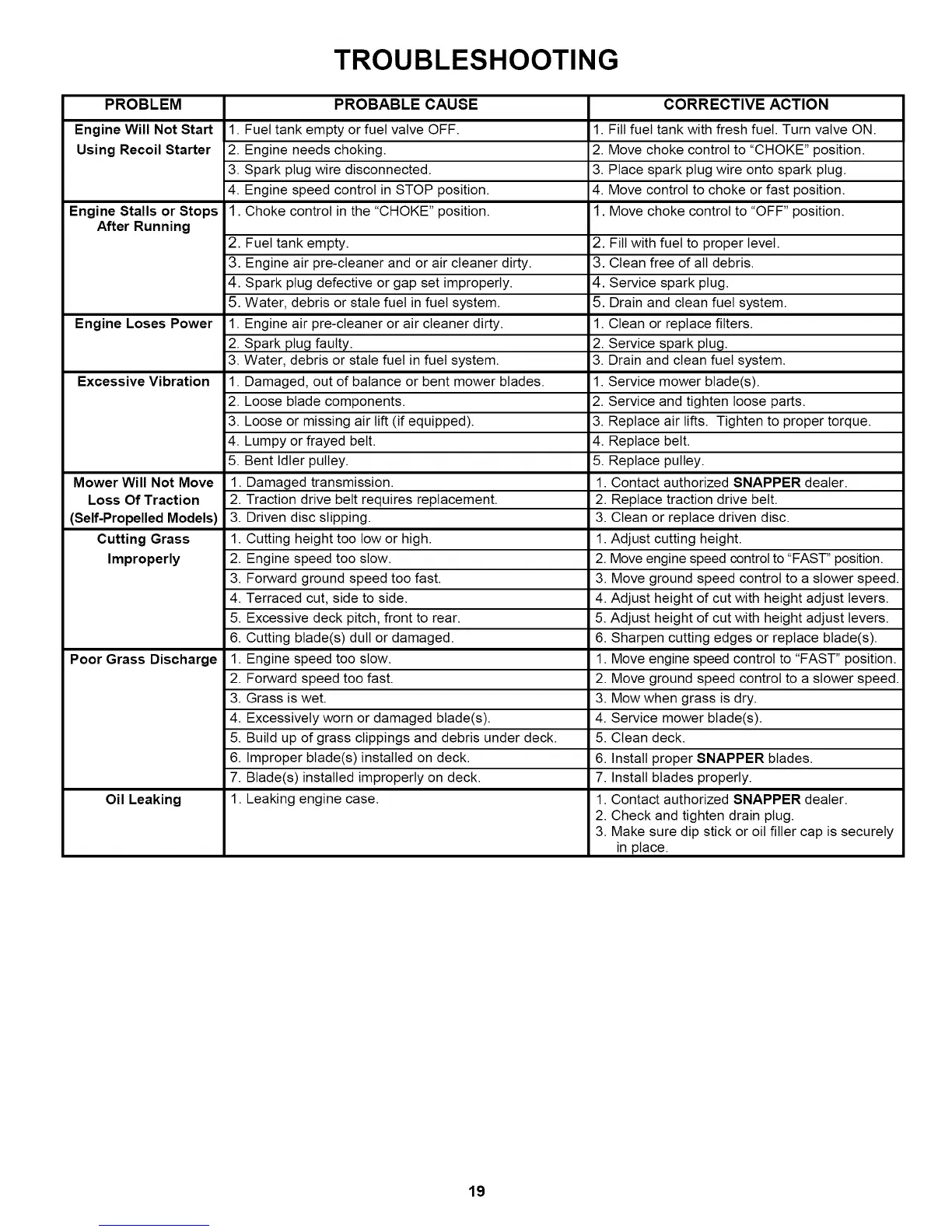 • Damaged transmission• 1• Contact authorized SNAPPER dealer•
